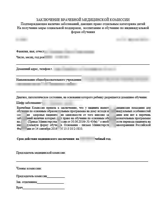 Намного реже решение не посещать образовательное учреждение возникает при постоянных конфликтных ситуациях, определенных религиозных убеждениях, требовании родителей по причине низкой успеваемости школьника. В бланке документа отражается персональная информация, название поликлиники, подписи врачей, шифр основного заболевания, перечень сопутствующих диагнозов, печати.