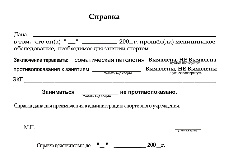 Для записи в спортивную секцию необходимо пройти медицинское обследование и получить врачебное заключение по форме 073/у. Выданная справка подтверждает отсутствие противопоказаний для занятий спортом у ребенка. Действует на протяжении 6 месяцев.
