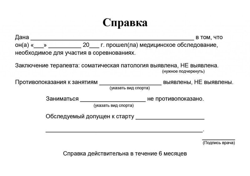 Получить справку для соревнований можно в государственном или частном медицинском центре, физкультурном диспансере, но у этих организаций обязательно должна быть лицензия на оказание услуг. Допуск можно выписать на бланке произвольной формы, но в нем обязательно указывают следующую информацию: