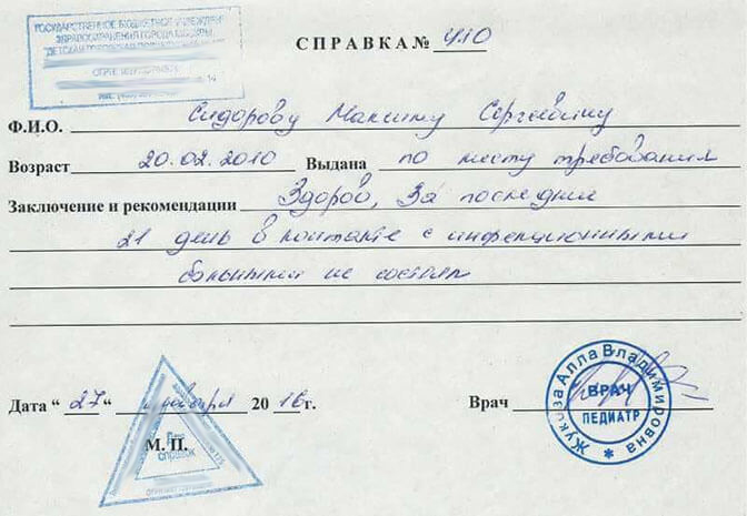 После поездки в некоторые страны, отпуска ребенку тоже может понадобиться справка от педиатра. Цена будет выше, если помимо осмотра врачом для заключения нужно сделать анализ на энтеробиоз (для бассейна), прийти на повторный прием.